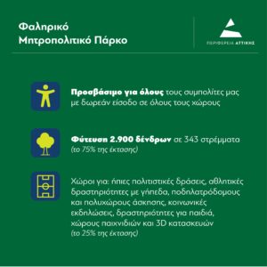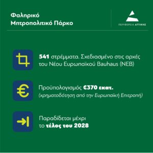Στην τελική τροχιά υλοποίησης μπαίνει η δημιουργία του πρότυπου πάρκου στον Φαληρικό Όρμο, το μεγαλύτερο έργο αστικής ανάπλασης που έχει υλοποιηθεί ποτέ στην Περιφέρεια Αττικής, μετά και την υπογραφή της σχετικής απόφασης για την ένταξη και χρηματοδότηση του έργου από την αρμόδια Ευρωπαία Επίτροπο Συνοχής και Μεταρρυθμίσεων, Eliza Ferreira. Το πάρκο, που εντάσσεται στο Νέο Ευρωπαϊκό Bauhaus, θα έχει έκταση 541 στρεμμάτων, ενώ ο συνολικός προϋπολογισμός του έργου ανέρχεται σε 370 εκατ. ευρώ.